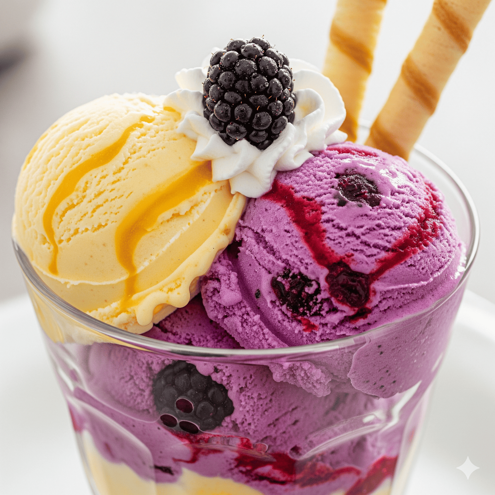 Copa de Tropical y mora crema con 2 galletas oblea