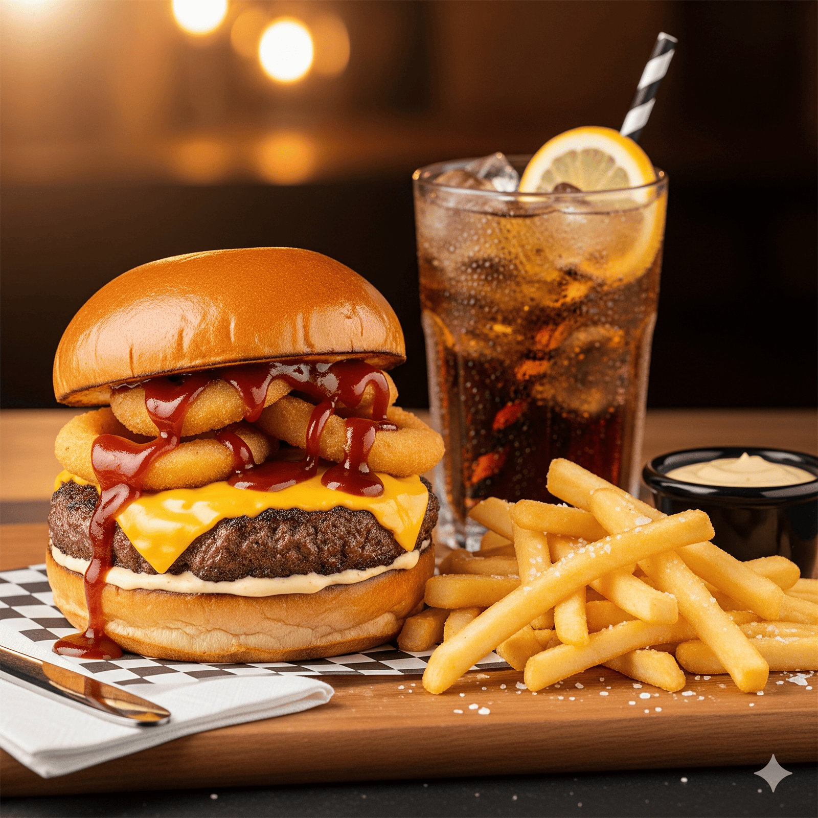 Smash burger (hamburguesa, queso, aros de cebolla, salsa barbacoa) + bebida + papas fritas + salsa a elección